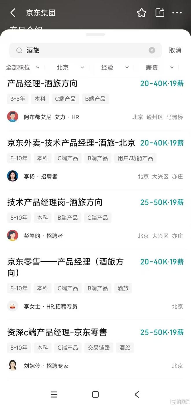 在BOSS上搜了搜,京东集团最近确实在大肆高新招聘酒旅方面人才,包括不限于技术岗、管理岗,看起来像是要在酒旅方面有大动作。