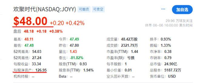 挚文集团的股价够低,但从PB来看,前YY的母公司欢聚集团才是最短的“烟蒂”。以21亿美元将YY卖给百度后,欢聚集团的总市值竟然只有25亿美元左右,由于账上囤积了大量现金后,欢聚的净资产已经是市值的两倍以上。