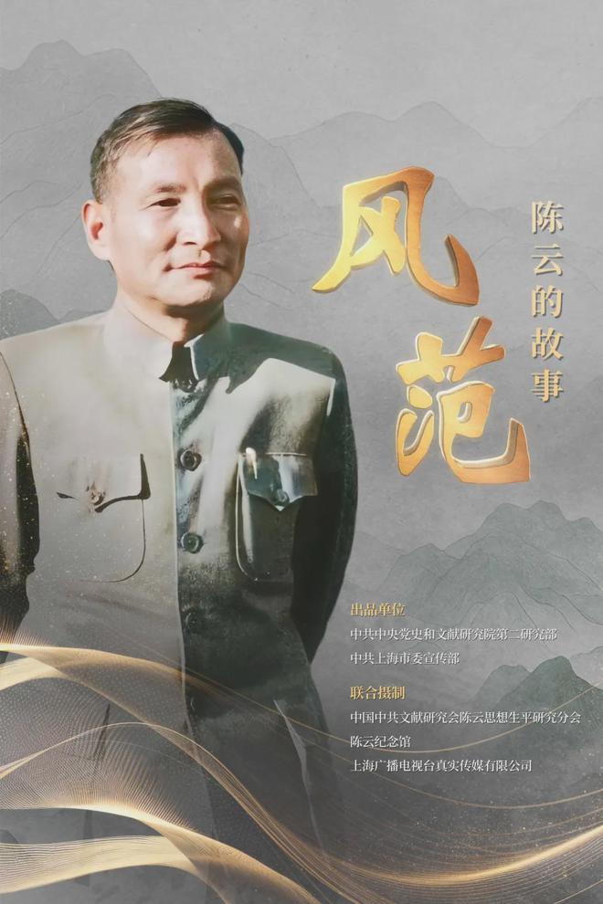 文献纪录片《风范:陈云的故事》由中共中央党史和文献研究院第二研究部、中共上海市委宣传部出品,中国中共文献研究会陈云思想生平研究分会、陈云纪念馆、上海广播电视台真实传媒有限公司联合摄制,谨以此片纪念陈云同志诞辰120周年。