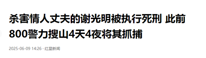 说起来这事儿挺让人唏嘘的。湖南衡阳昨日传来一则沉重的消息:因故意杀人罪潜逃的谢光明,在2025年6月6日被依法执行死刑。... 说起来这事儿挺让人唏嘘的。湖南衡阳昨日传来一则沉重的消息:因故意杀人罪潜逃的谢光明,在2025年6月6日被依法执行死刑。这起看似简单的刑事案件背后,却牵扯出一段复杂的情感纠葛,更引发了全网关于婚姻、道德与法律的激烈讨论。