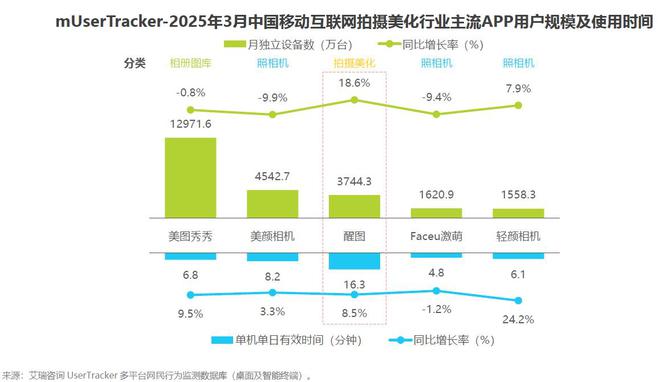 美图是国内影像领域的头部玩家。调研机构艾瑞咨询数据显示,2025年3月,国内互联网拍摄美化主流APP用户规模排名第一和第二的美图秀秀、美颜相机均来自美图,第三名是字节旗下的醒图。
