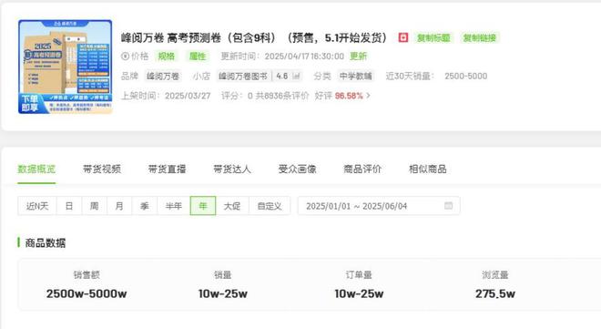 再比如说,这次高三学生购买的《峰阅万卷高考预测卷》的图书,今年3月底4月初上架预售,售价为168元,4月份仅在抖音电商平台销售额就已达2500万—5000万元。