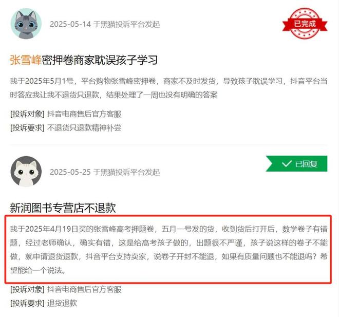 河南一高三考生家长在张雪峰团队直播间花168元下单了2025年高考预测卷,发现有题目出错,反馈后客服承认题目存在错误,但拒绝退货退款,理由是“预测卷密封条拆封后不支持退货”。