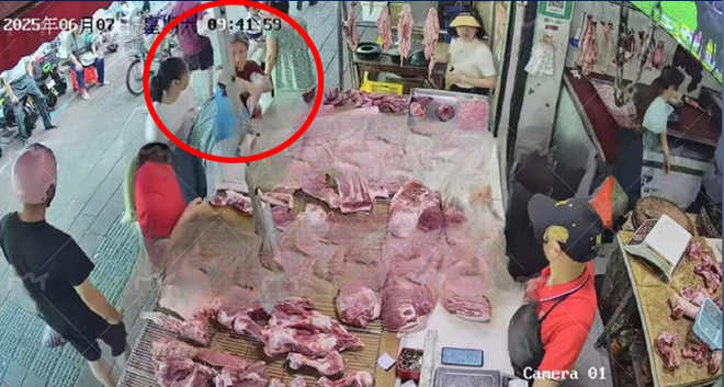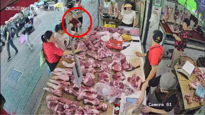 监控画面显示,铺案上摆放多块牛肉,6月7日9:41:59,这名穿枣红色上衣的老年女子伸手去拿了一块牛肉,想放进蓝色袋内,被旁边一名穿白衣的女子看到,老年女子停手。