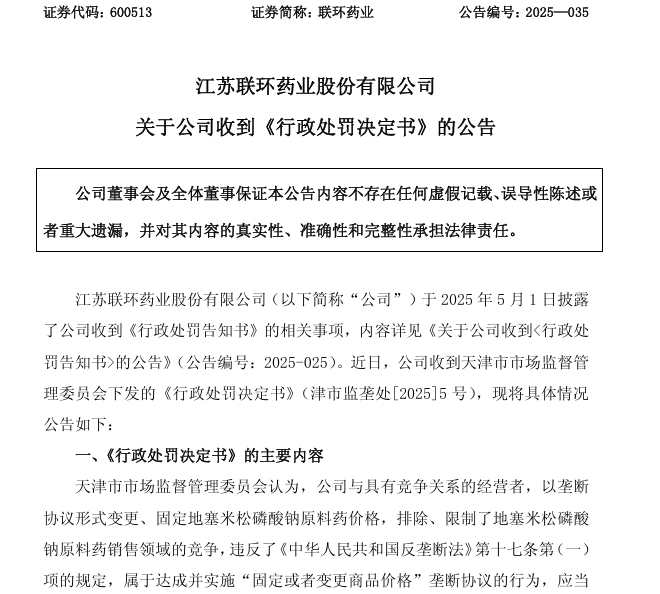 红星资本局6月11日消息,6月10日晚间,联环药业(600513.SH)发布公告,近日收到天津市市场监督管理委员会下发的... 红星资本局6月11日消息,6月10日晚间,联环药业(600513.SH)发布公告,近日收到天津市市场监督管理委员会下发的《行政处罚决定书》。监管部门认为,公司与具有竞争关系的经营者,以垄断协议形式变更、固定地塞米松磷酸钠原料药价格,排除、限制了地塞米松磷酸钠原料药销售领域的竞争,违反了《中华人民共和国反垄断法》第十七条第(一)项的规定,属于达成并实施 “固定或者变更商品价格” 垄断协议的行为,应当依据《反垄断法》第五十六条的规定依法追究法律责任。