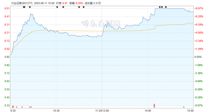截至6月11日收盘,兴业证券大涨9.29%,报6.47元/股,总市值558.7亿元。