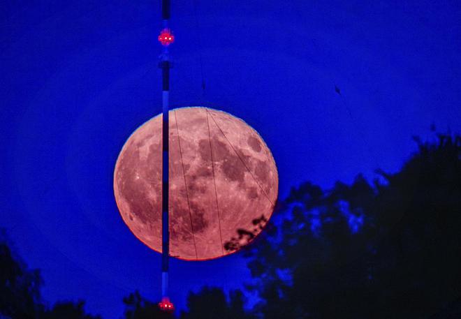 当地时间2025年6月11日,德国梅克伦堡-前波美拉尼亚州什未林,什未林湖上空,“草莓满月”在傍晚时分升起,在电视塔天线后可见。