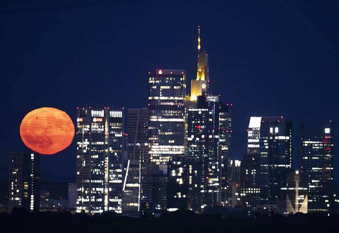 当地时间2025年6月11日,德国黑森州法兰克福,夜空中巨大的“草莓满月”悬挂在法兰克福的金融区天际线上。