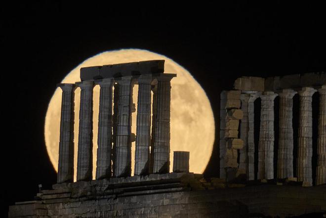 当地时间2025年6月11日,希腊雅典以南约70公里的苏尼翁角,“草莓满月”在古老的波塞冬神庙后方升起。