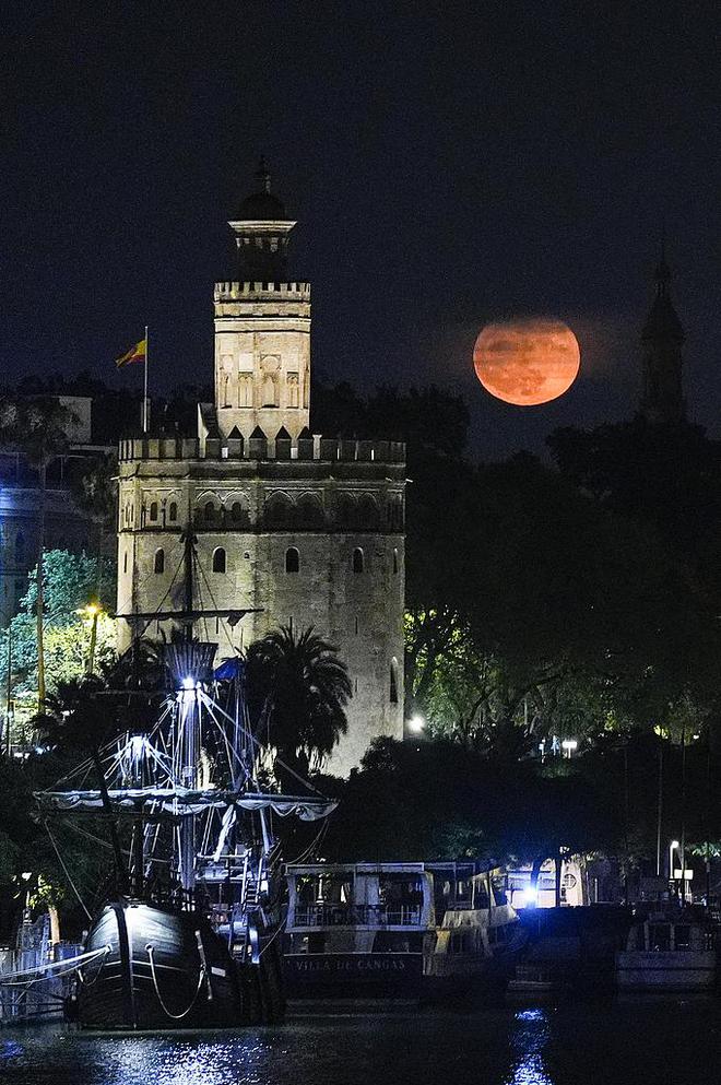 当地时间2025年6月11日,西班牙安达卢西亚塞维利亚,“草莓满月”出现在黄金塔上空。