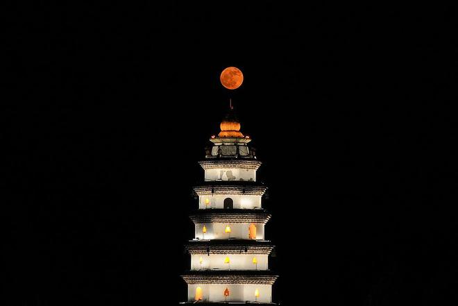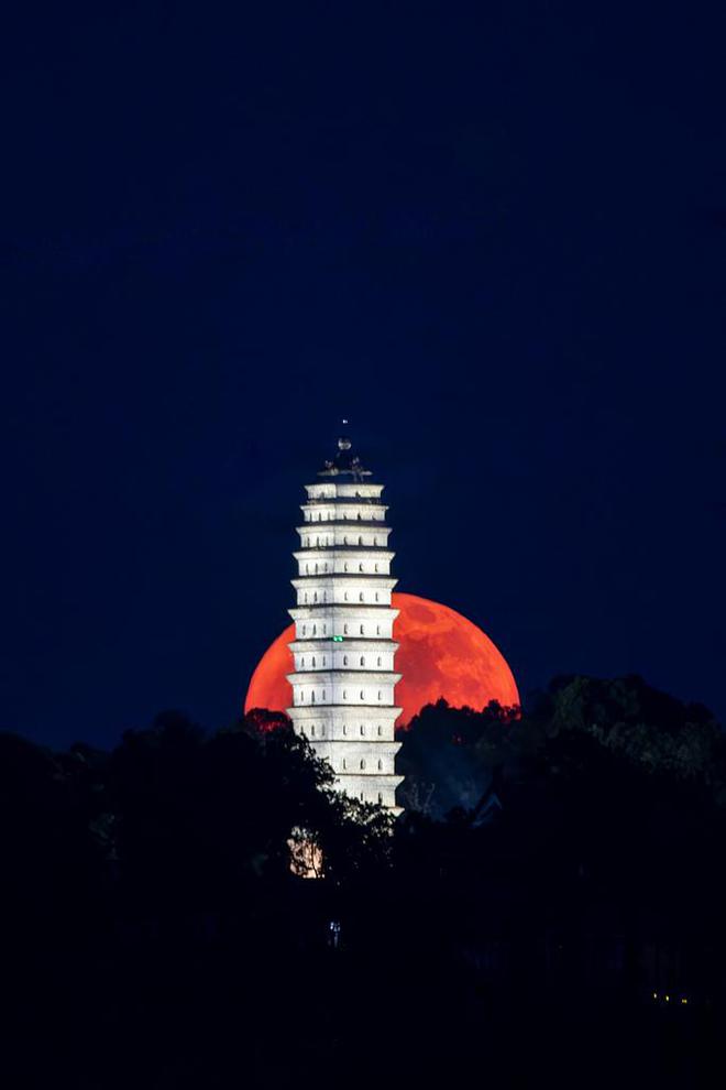 2025年6月11日晚,四川眉山,一轮超级红月亮穿过大旺寺白塔。(多重曝光)