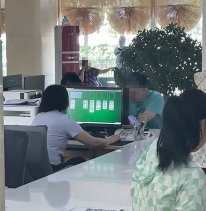 视频显示,一名背对镜头、穿浅蓝色制服的女性工作人员坐在工位上,疑似用台式电脑打扑克游戏,其对面有一位市民。