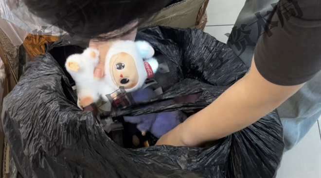 图说:商家从黑色塑料袋掏出仿制LABUBU