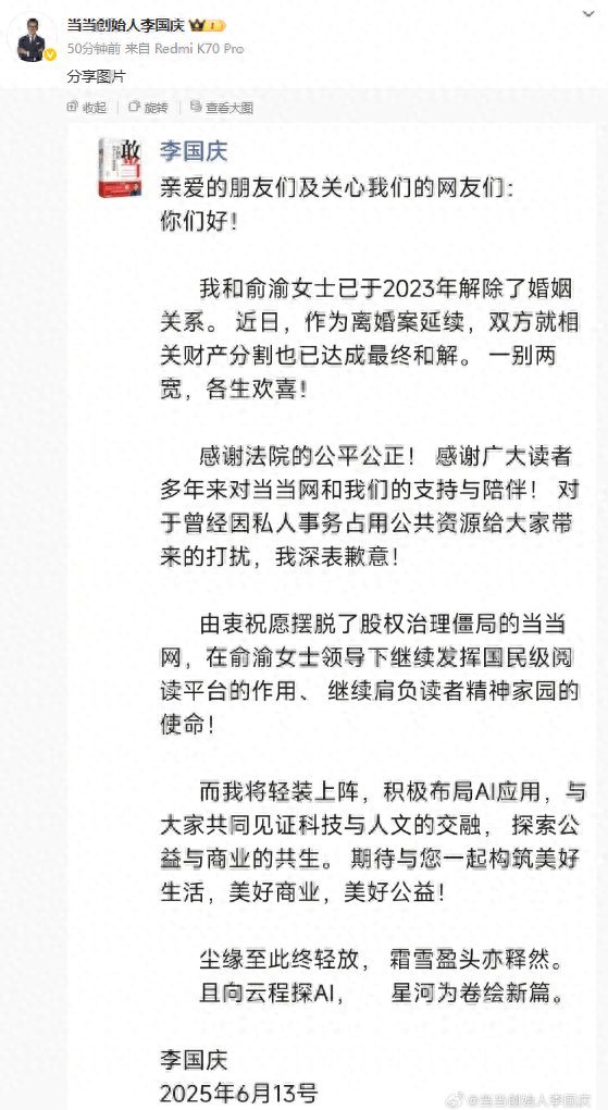 6月13日,当当网创始人李国庆在社交平台发文称,“我和俞渝已于2023年解除了婚姻关系。近日,作为离婚案延续,双方就相关... 6月13日,当当网创始人李国庆在社交平台发文称,“我和俞渝已于2023年解除了婚姻关系。近日,作为离婚案延续,双方就相关财产分割也已达成最终和解。”