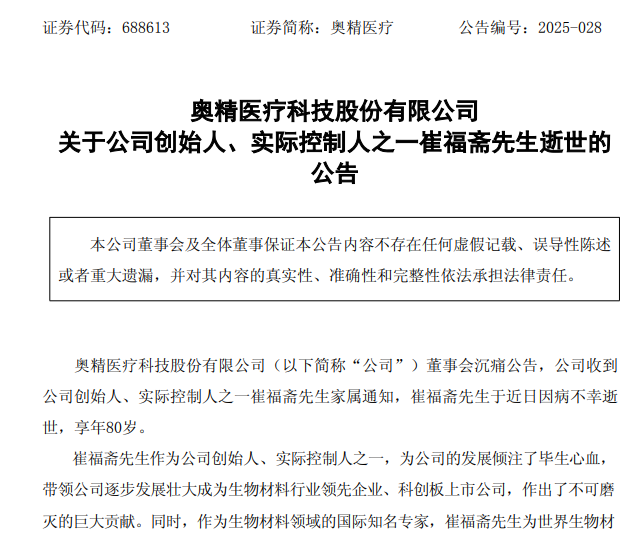 奥精医疗表示,崔福斋在公司担任首席科学家职务,不属于公司管理层,不会引起公司管理层变动,公司多年来已培养出稳定的核心技术团队,亦不会影响公司研发及经营的稳定性和独立性。崔福斋去世不会对公司生产经营造成影响。