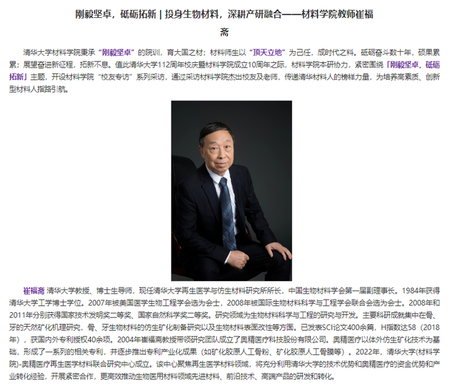 另据清华大学材料学院2023年介绍,崔福斋系清华大学教授、博士生导师,任清华大学再生医学与仿生材料研究所所长,中国生物材料学会第一届副理事长。该学院退休人员名单显示,崔福斋位列其中。