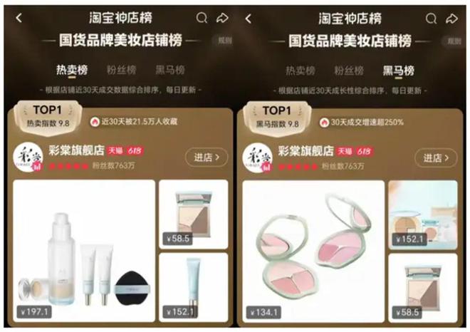 今年6月,彩棠淘宝旗舰店冲上了国货美妆店铺热卖榜和黑马榜的榜首;