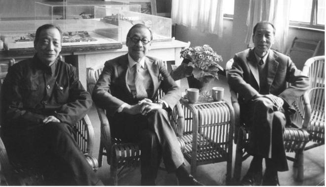 1981年4月,贝聿铭首次访问同济大学,与陈从周(左)、冯纪忠(右)合影。