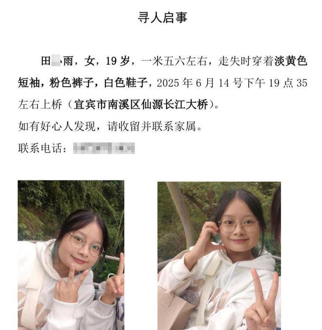 本该在教室里和同学说笑的年纪,却突然在大桥上消失了踪影。19岁的大一女生田某雨,从四川宜宾一所高校的校门走出后,在仙源长... 本该在教室里和同学说笑的年纪,却突然在大桥上消失了踪影。19岁的大一女生田某雨,从四川宜宾一所高校的校门走出后,在仙源长江大桥的监控盲区里失去了踪迹。这几天,她的家人揣着寻人启事在街头奔走,手机屏幕上还留着她最后发送的表情包,而网络上关于此事的讨论,正随着时间推移变得越来越沉重。
