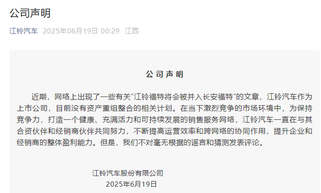 江铃汽车方面表示,作为上市公司,江铃汽车目前没有资产重组整合的相关计划。在当下激烈竞争的市场环境中,为保持竞争力,打造一个健康、充满活力和可持续发展的销售服务网络,江铃汽车一直在与其合资伙伴和经销商伙伴共同努力,不断提高运营效率和跨网络的协同作用,提升企业和经销商的整体盈利能力。但是,不对毫无根据的谣言和猜测发表评论。