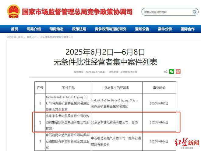 微成都报道日前,根据国家市场监督管理总局公示,京东旗下北京京东世纪贸易有限公司(简称“京东世贸”)收购四川生活家家居集团... 微成都报道日前,根据国家市场监督管理总局公示,京东旗下北京京东世纪贸易有限公司(简称“京东世贸”)收购四川生活家家居集团有限公司(简称“生活家”)股权案获无条件批准,正式审结日期为2025年6月4日。
