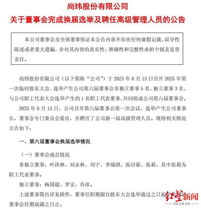 6月13日晚间,尚纬股份发布《关于董事会完成换届选举及聘任高级管理人员的公告》。根据公告,叶洪林、刘永林、刘宁、李瑞琪、张浔萦、张莉当选为新一届董事会非独立董事。其中,叶洪林当选新一届董事会董事长。