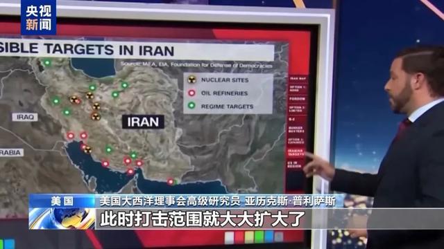 美国大西洋理事会高级研究员 亚历克斯·普利萨斯:我认为这是最不可能首先采用的选项。但如果我们真的决定发动袭击,除了福尔多,还有哪些目标,可以看到这里有核设施的标记。还有政府目标、炼油厂,此时打击范围就大大扩大了。更有可能的是这种情况可能只会在伊朗决定攻击在该地区的美军时发生。