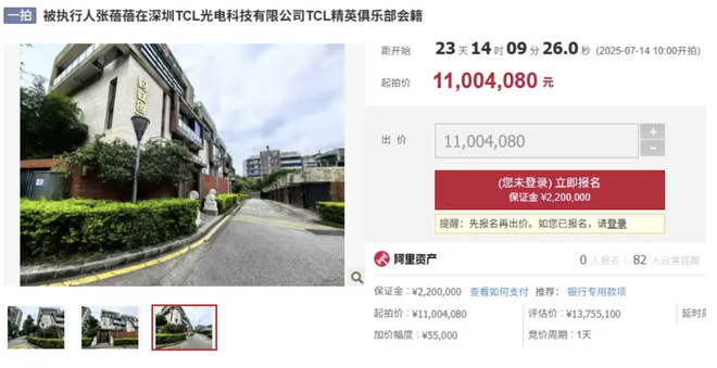 阿里拍卖平台信息显示,该会籍特殊之处在于包含一处房产的使用权。被拍卖的是自然人张蓓蓓持有的深圳TCL光电科技有限公司TCL精英俱乐部会籍,含深圳市南山区一处房产的使用权,实用面积约347.23㎡,用途为工业研发。