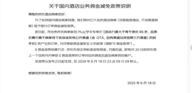 6月18日,京东官方微信公众号发布了一封致酒店经营者的公开信,正式宣布进入OTA行业。信中提到,酒店商家参与“京东酒店PLUS会员计划”,最高能享受到三年0佣金。