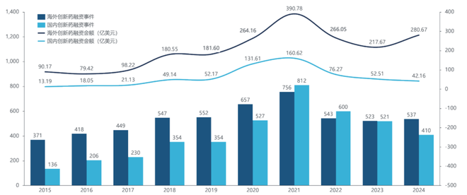 2015-2024年期间全球创新药领域一级市场融资概况,数据来源:医药魔方报告