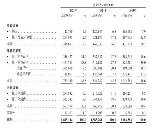 具体来看,零售商渠道对颖通控股的业绩贡献最大,其次是分销渠道和直销渠道。据招股书显示,截至2025年3月31日,颖通控股的直销渠道中共运营49家网店,同时,该公司在中国内地、香港、澳门共经营了117个线下门店和专柜。同期,颖通控股的零售商渠道、分销渠道和直销渠道的年营收分别为10.13亿元、6.33亿元和4.31亿元,占比分别为48.6%、30.4%和20.7%。
