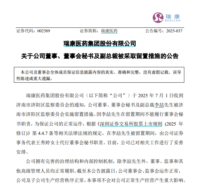 瑞康医药表示,因李喆在留置期间不能履行董事会秘书职责,为保证公司的正常运作,由公司证券事务代表王秀婷代行董事会秘书职责。除李喆外,董事、监事和其他高级管理人员均正常履职。截至本公告披露日,公司董事会、监事会运作正常,公司及子公司生产经营秩序正常,本事项不会对公司正常生产经营产生重大影响。