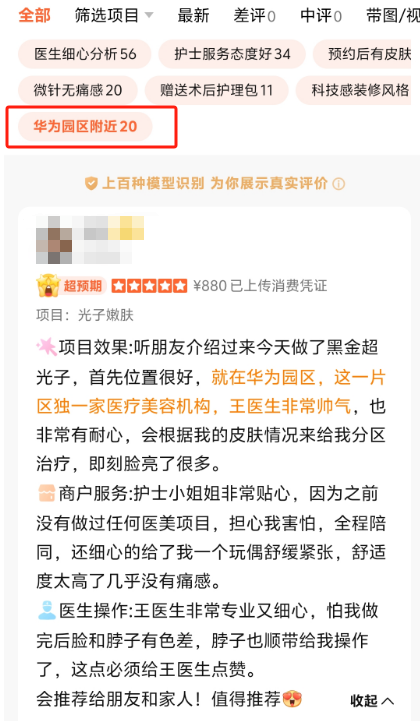 红星资本局还通过大众点评注意到,该诊所为医美诊所,产品包括黄金微针、冰点脱毛以及水光注射等,人均消费为2218元。多位消费者在评论时提到,该诊所在华为园区附近。