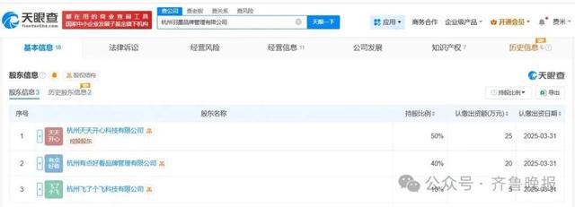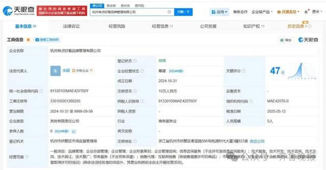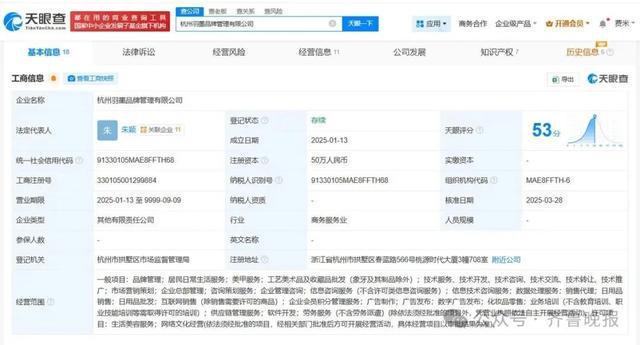 天眼查App显示,杭州羽墨品牌管理有限公司成立于2025年1月,法定代表人为朱颖,注册资本50万人民币,经营范围包括品牌管理、居民日常生活服务、美甲服务等,由杭州天天开心科技有限公司、杭州有点好看品牌管理有限公司、杭州飞了个飞科技有限公司共同持股。