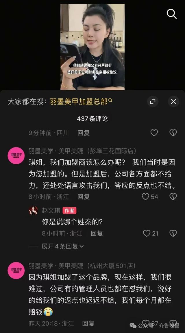 赵文琪发视频后,数位加盟商在其评论区留言维权“我们加盟商怎么办”,声称“我们每个月都在赔钱”。