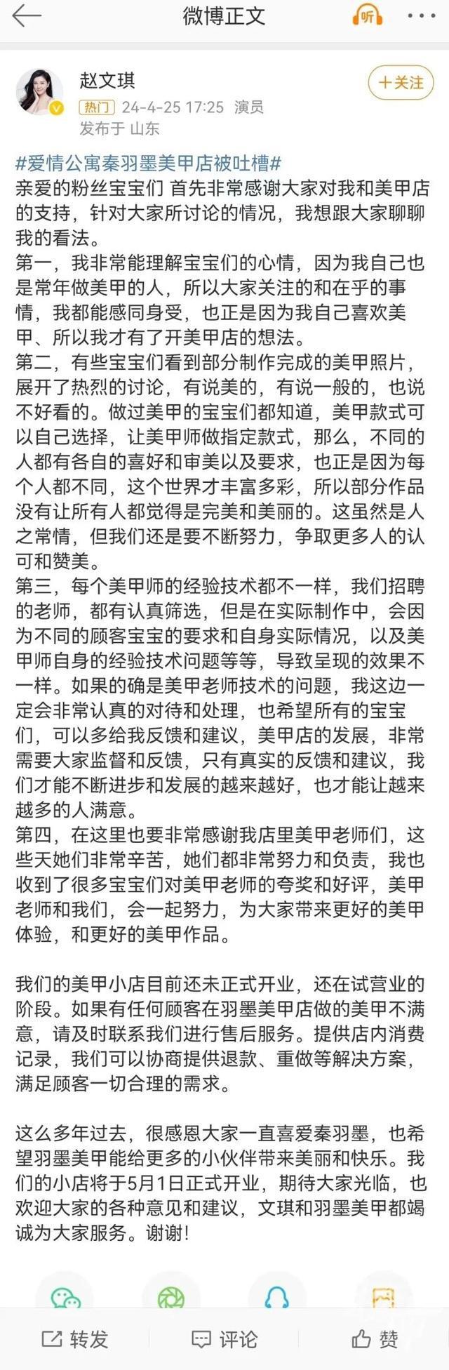 赵文琪本人在微博用长文回应了网友们的吐槽,也表示虚心接受大家的建议,后续会更努力让大家满意。