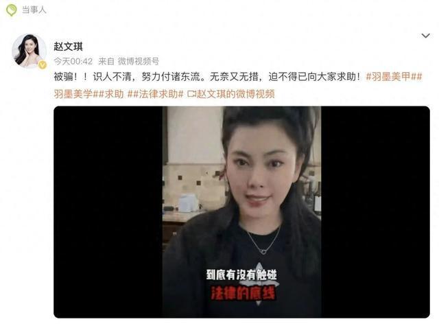 7月4日,曾在《爱情公寓》中饰演秦羽墨的演员赵文琪发视频自曝被合伙人欺骗利用:“被骗!识人不清,努力付诸东流。无奈又无措... 7月4日,曾在《爱情公寓》中饰演秦羽墨的演员赵文琪发视频自曝被合伙人欺骗利用:“被骗!识人不清,努力付诸东流。无奈又无措,迫不得已向大家求助。”