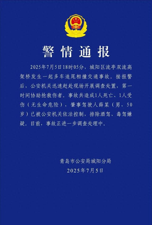 青岛一高架多车追尾,致1死1伤!薛某(男,50岁)已被控制