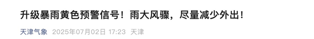 当时天津将暴雨蓝色预警信号升级为黄色预警信号
