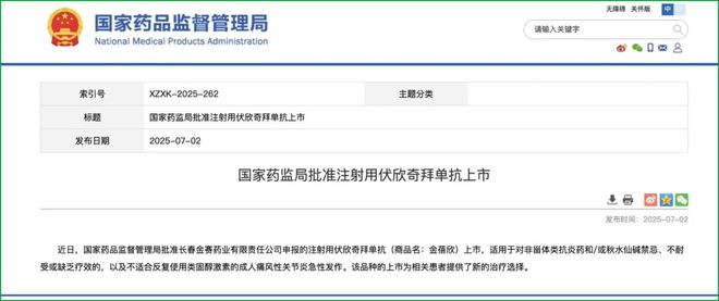 7月2日,长春高新发布公告,其控股子公司金赛药业研发的1类新药——注射用伏欣奇拜单抗(商品名:金蓓欣)已正式获得国家药品监督管理局(NMPA)的批准上市。消息如同巨石投湖,在资本市场上激起巨大涟漪,推动长春高新股价罕见涨停。