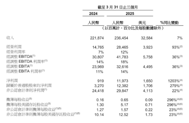 阿里巴巴第四财季(注:阿里巴巴财年与自然年不同步,2024年4月1日至2025年3月31日为2025财年),营收为2364.54亿元,同比增长7%。不按美国通用会计准则(non-GAAP),净利润为298.47亿元(约合41.13亿美元)。