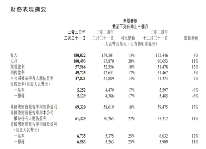 腾讯控股(00700.HK)2025年一季度财报显示,实现营收1800.2亿元,同比增长13%,毛利1004.9亿元,同比增长20%,经营利润(Non-IFRS)693亿元同比增长18%。