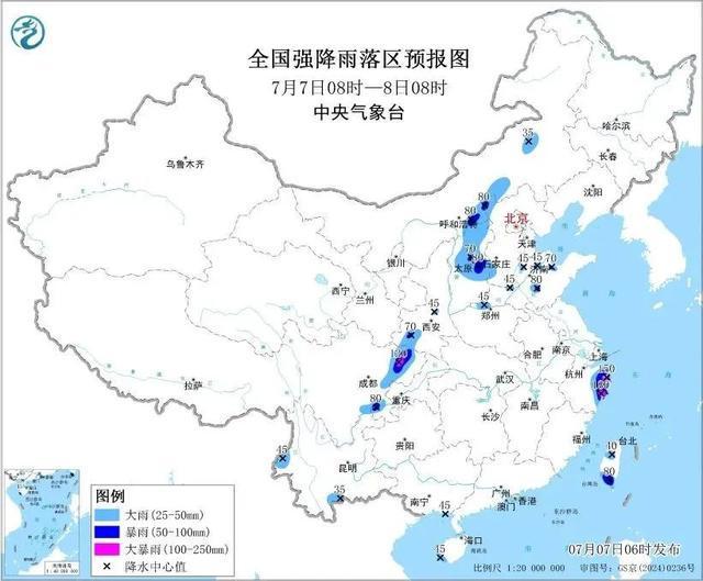 预计,7月7日8时至8日8时,浙江东部、内蒙古中部、山西中北部、河北西北部和西南部、山东北部、河南西北部、陕西西南部、四川东部、云南西南部、台湾岛等地部分地区有大到暴雨,其中,浙江东部、四川东部等地部分地区有大暴雨(100~180毫米)。上述部分地区伴有短时强降水(最大小时降雨量20~50毫米,局地可超过70毫米),局地有雷暴大风等强对流天气。