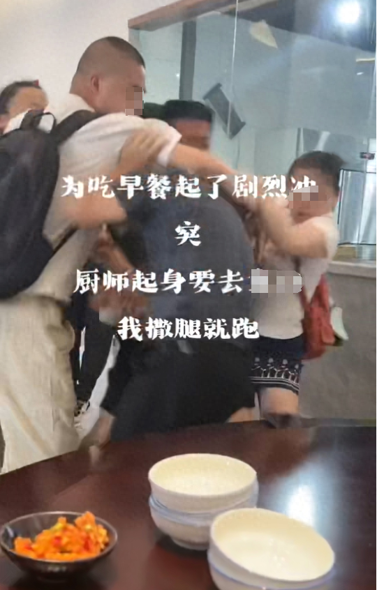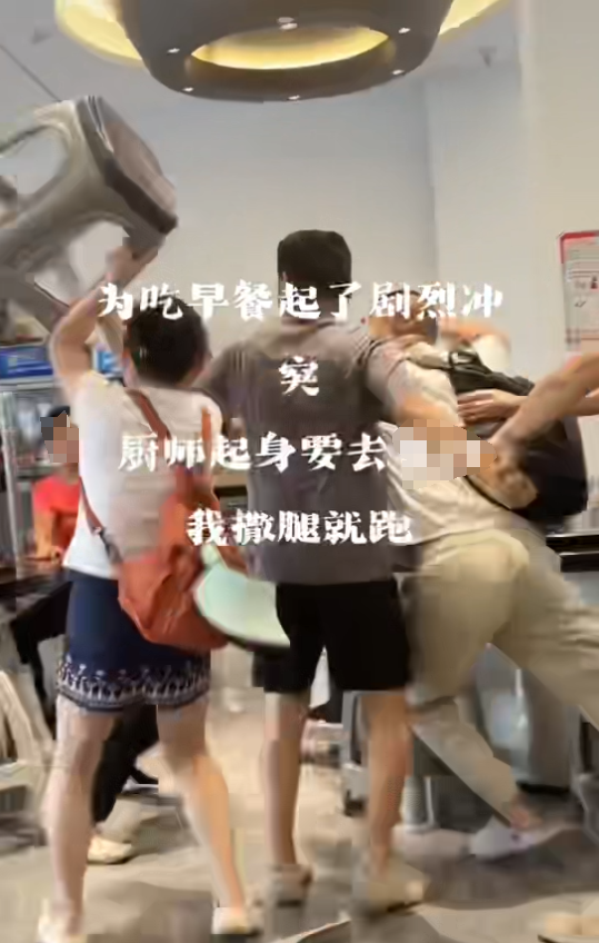 31秒现场视频显示,游客和餐厅工作人员发生“混战”,一名背包穿短裙的女子抄起塑料凳子砸一名男子头部。发视频的这位游客表示:“为吃早餐起冲突,厨师起身要去拿刀,我撒腿就跑。”