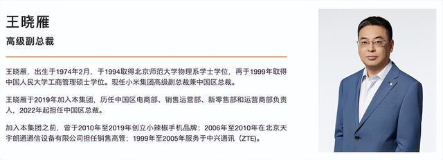 王晓雁加入小米是在2019年,先后负责小米中国区电商部、销售运营部、新零售部和运营商部等关键业务板块。2023年,他晋升为小米集团副总裁,兼任集团中国区总裁。