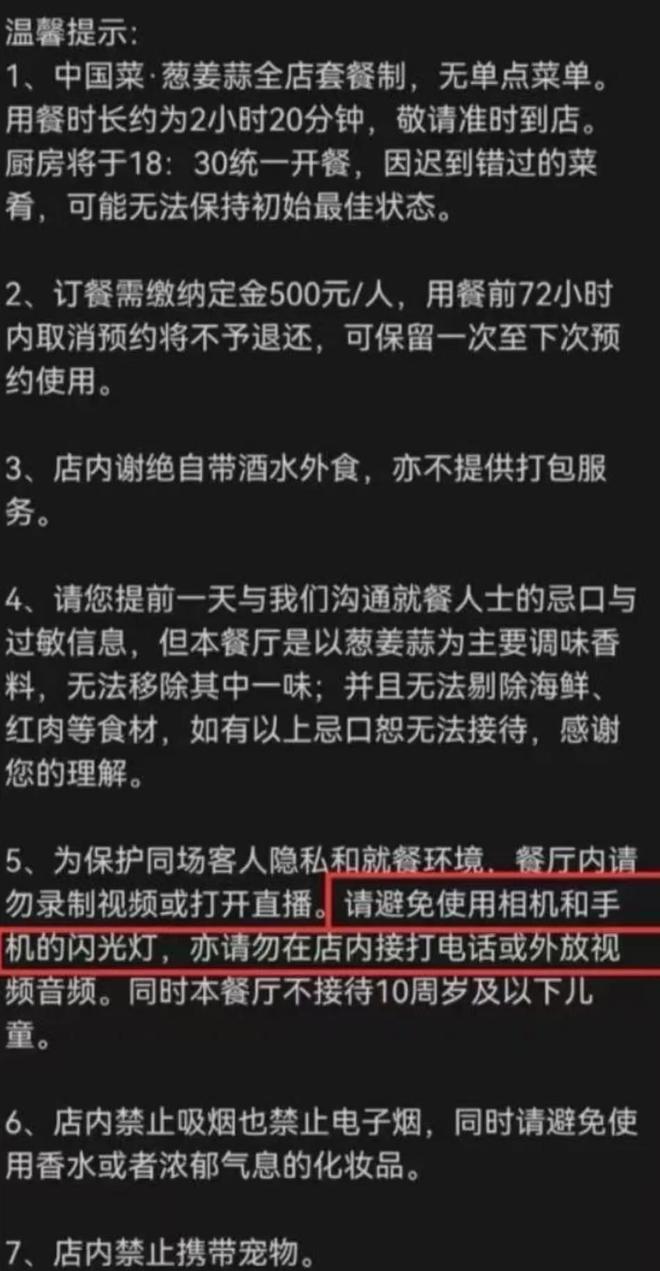 事后,这位顾客才意识到,餐厅或许早有“规矩”。她回忆起预约时曾收到过餐厅发来的微信确认链接,但当时并未点开查看详情——后来才知道,禁止拍摄视频等规定就隐藏在那个链接里。随着事件在网络上发酵,餐厅那份长达350多字的用餐须知也被公开,7条规定条条“硬核”:除了明确用餐时长和开餐时间,还包括每人需缴纳500元定金,若在就餐前72小时内取消预约,定金不予退还,仅可保留一次用于下次预约;店内谢绝自带酒水和外食,且不提供打包服务;禁止录制视频或开启直播,也不允许接打电话或外放音频视频;不接待10周岁及以下儿童;甚至提醒顾客避免使用香水、禁止携带宠物。
