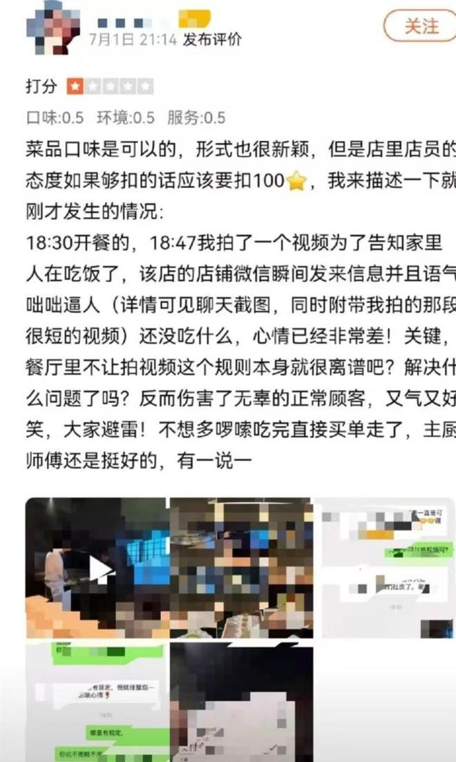 事件的起因并不复杂。一位女顾客在该餐厅用餐时,出于记录的想法,用手机拍摄了一段时长6秒的厨师烹饪视频。然而,视频刚拍完没多久,她的微信就收到了餐厅工作人员的消息,明确提醒“店内只可拍照,不可拍视频”。更让她感到不适的是,从用餐开始,身后就一直站着两名服务员,这种时刻被注视的感觉,让她直言“像是在被偷窥”。最终,这顿花费3621元的餐食,留给她的不是愉悦,而是强烈的被冒犯感。