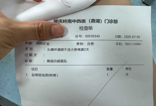 曾女士提供7月5日到医院就诊的诊断记录显示,血常规检测,诊断为肠胃功能紊乱。她感觉头痛伴腹部不适,拉肚子。