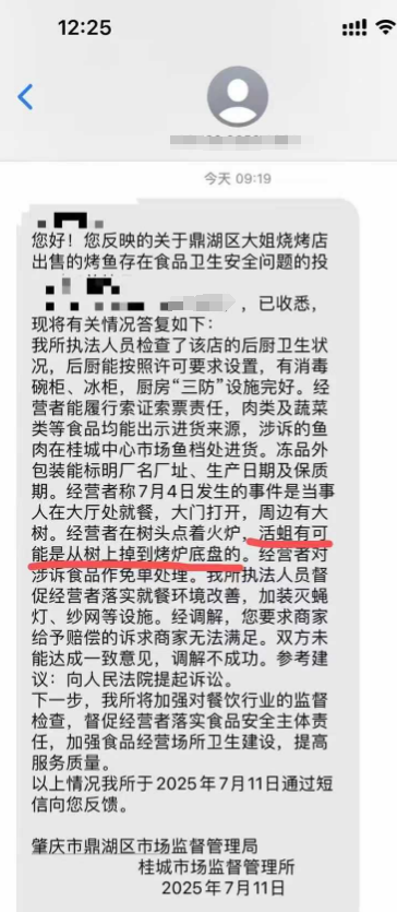 “我是周末去肇庆玩的,不是本地人。”7月12日上午,曾女士收到肇庆市鼎湖区市场监督管理局桂城市监所的答复,事发已8天,她感到维权很难。