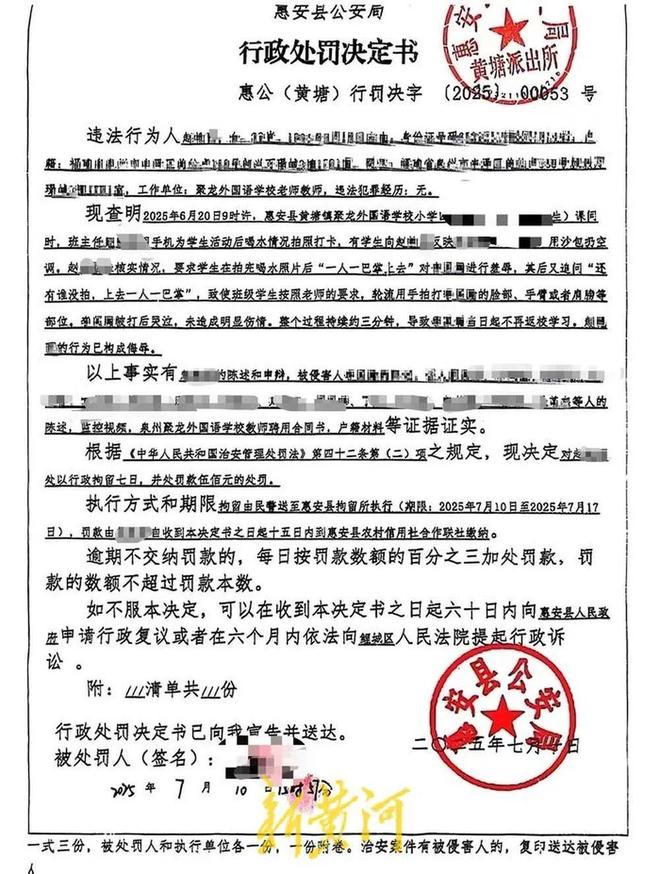 但李某某的爸爸李先生不认可学校的说法,觉得他们避重就轻。李先生拿出警方7月10日的处罚决定:赵老师因为这事被行政拘留七天,罚款五百块。李先生说,学校通报里只提“打一下”,可实际是“轮流扇巴掌”,明显是隐瞒了严重性。